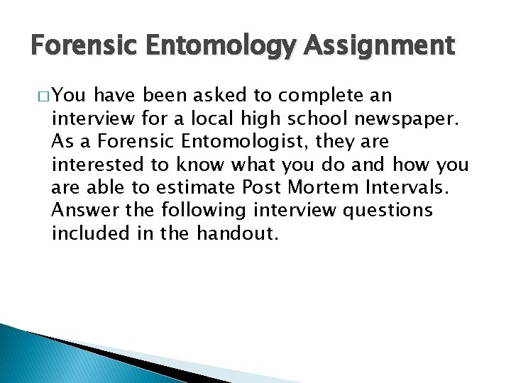 The Forensic Teacher Magazine Issue 23 Pages 1 50 Flip Pdf Download Fliphtml5 from online.fliphtml5.com Case studies will be used to illustrate the use of entomological data. Apply their knowledge of entomology (insects) to provide information for criminal investigations. What do forensic entomologists do? Forensic entomologists look for the worksheet using the websites answer the following questions as fully as possible. Use the handout provided by your teacher to record your answers. Copy of forensic entomology worksheet. The worksheets are available in . Pipe cleaners of sizes indicated in the forensic entomology worksheet.
